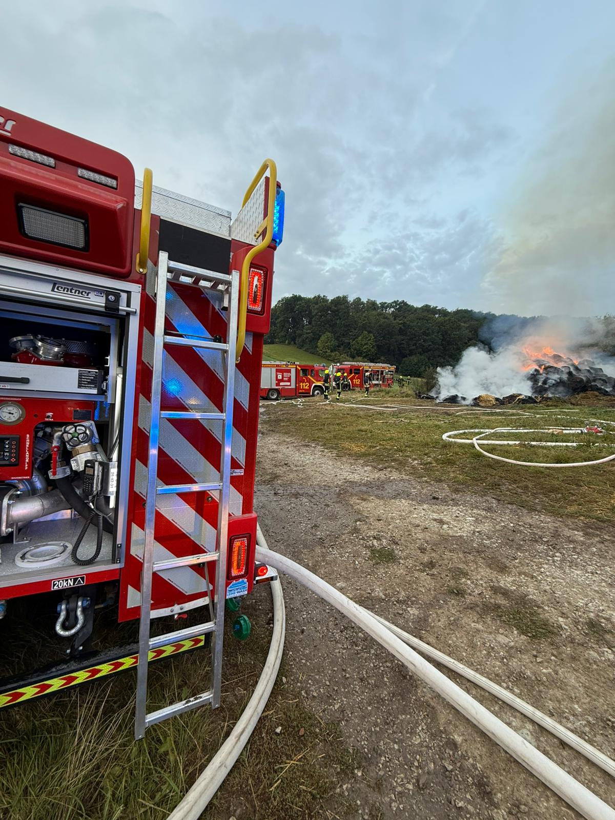 Einsatzdetails: Alarmierung zum B1- Feuer (Wald). Es brannten mehrere aufgestapelte Strohballen am Feldrand zum Wald in Langholzen. Wir übernahmen mit unserem Fahrzeug die Brandbekämpfung auf einem Abschnitt der Strohballen. Mit dem MTW wurde die Versorgung der Einsatzkräfte übernommen.